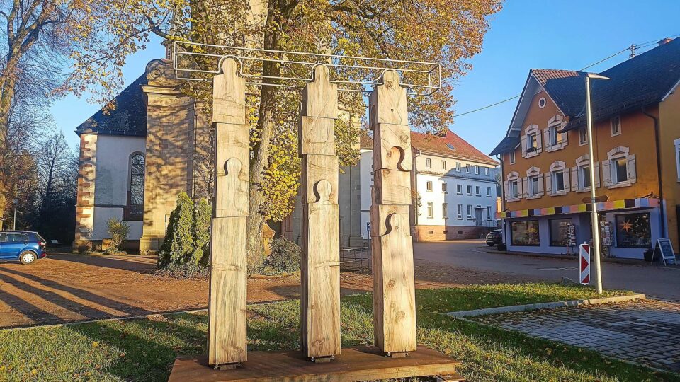 Vor der Kirche „Maria zu den Ketten“ steht eine Holzskulptur des Künstlers Steigerwald aus Steinach. Die Skulptur, hergestellt aus dem Holz eines ganz speziellen Mammutbaums, symbolisiert eine Brücke zwischen den Stadtteilen Zell und Unterharmersbach.