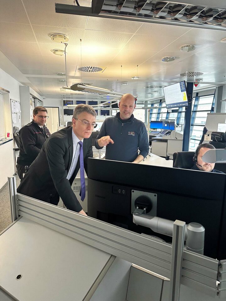 Landrat Thorsten Erny besucht die Integrierte Leitstelle im Ortenaukreis. Sie wird betrieben vom Ortenaukreis und dem Deutschen Roten Kreuz und ist die Schaltzentrale für die Alarmierung und Koordination der Hilfs- und Rettungsorganisationen in der Region.