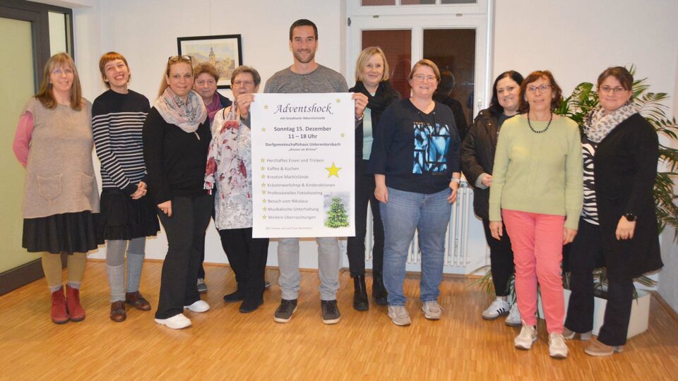 Am Sonntag, 11. Dezember, findet in Unterentersbach von 11 bis 18 Uhr erstmals ein Adventshock statt. Gefeiert wird beim Dorfgemeinschaftshaus Unterentersbach »drusse un drinne«. Die Besucher erwarten kreative Marktstände, Essen und Trinken, Kinderbasteln und eine Märchenerzählerin. Auch der Besuch vom Nikolaus und musikalische Unterhaltung stehen auf dem Programm.