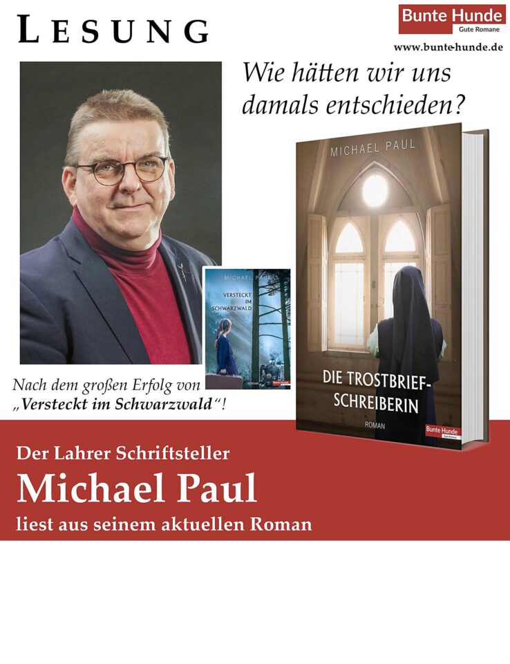 Am 9. März 2024, um 19 Uhr liest Michael Paul im Leseraum der Hansjakob-Halle aus seinem neuen, spannenden Roman „Die Trostbriefschreiberin“.