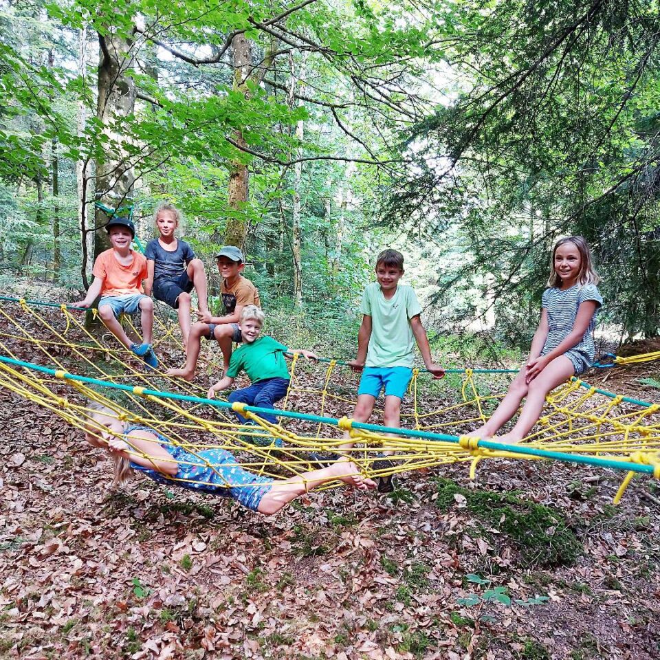 Sieben Schulkinder haben gelernt, wie man in Seilen Knoten macht, die sie zu Spielgeräten werden lassen.