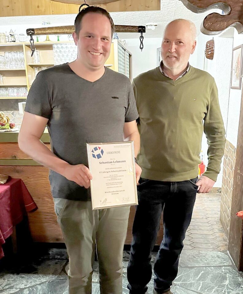 Maurer Sebastian Lehmann feiert sein 15-jähriges Arbeitsjubiläum beim Bauunternehmen Lehmann. Er war der erste Lehrling im Unternehmen.