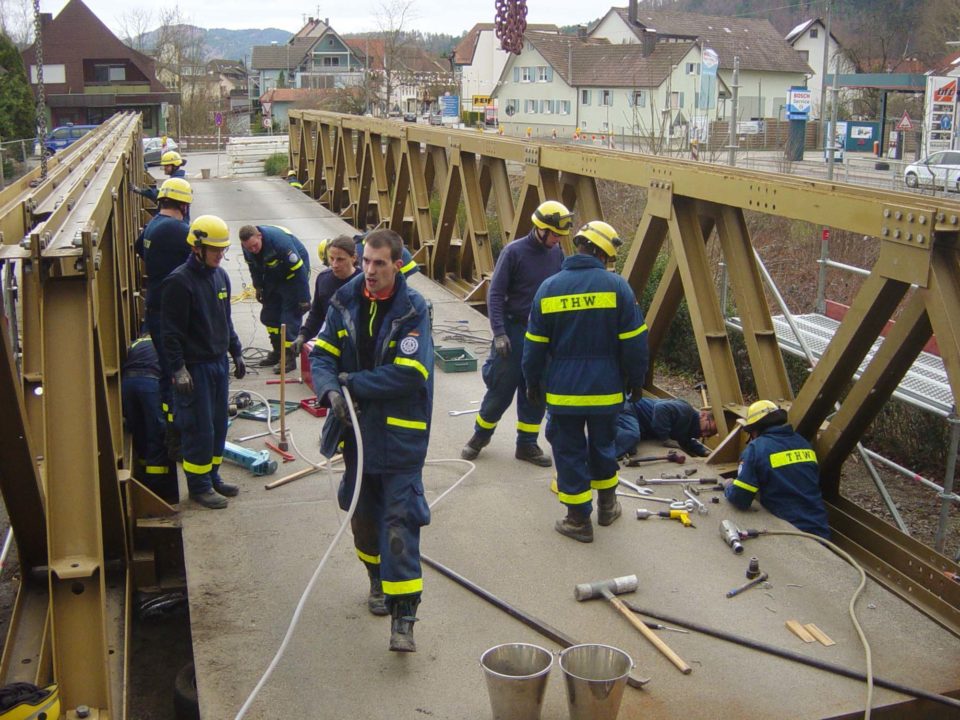 Zwei Helfer des THW Müllheims stehen auf der gerade gesetzten Brücke, wagen kühn einen Luftsprung, landen – der Brückenkoloss hält. Lachend wischen sie sich die Perlen von der Stirn – Freude und Begeisterung stehen ihnen und ihren Kollegen ins Gesicht geschrieben. Es ist deutlich zu spüren: Die Anspannung ist weg, das Projekt ist geschafft.