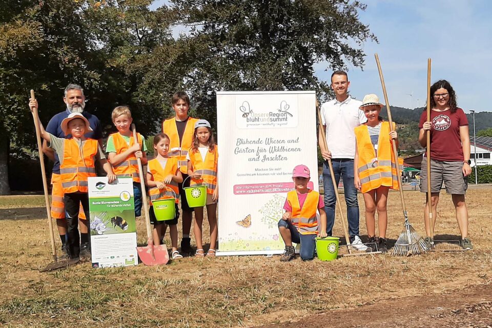 Summen und brummen soll es zukünftig auf der neu angelegten Blumenwiese im Park in der Bahnhofskurve in Biberach. Im Rahmen des Sommerferienprogramms 2022 haben einige Kinder gemeinsam mit Bürgermeister Jonas Breig eine Blumenwiese angesät.