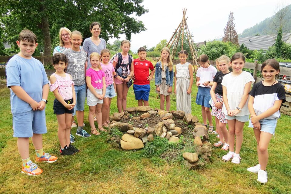 16 Schüler*innen der Garten-AG kümmern sich mit ihren Lehrerinnen Natalie Lauble und Elke Reinisch um den Garten unterhalb der Schule.