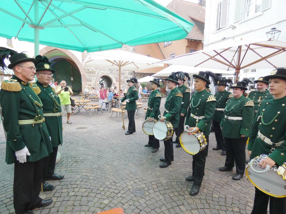 »Stillgestanden«, lautete einer der Befehle, die stellvertretender Tambourmajor Peter Bürkle an den Spielmannszug der Zeller Bürgerwehr richtete. Sein letztes Kommando aber lautete: »Zum Freibier wegtreten!« Sehr zur Erheiterung aller Gäste, die sich am vergangenen Samstagabend auf dem Zeller Kanzleiplatz eingefunden hatten.