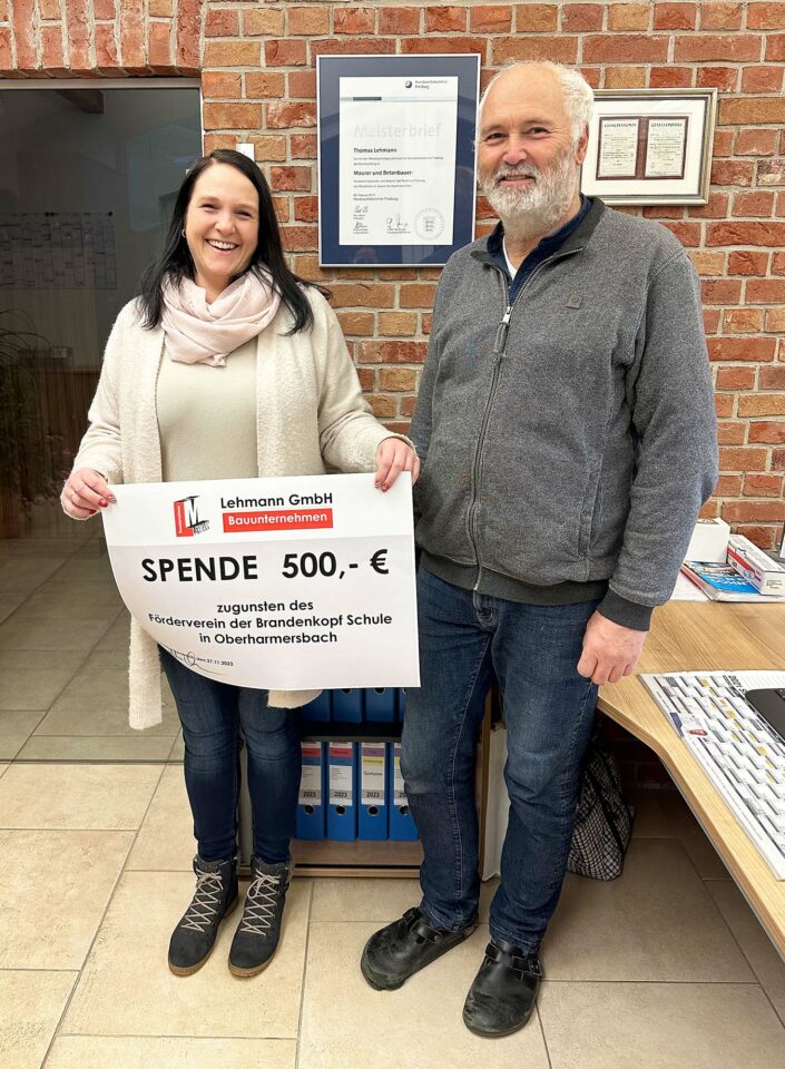 Die Firma Lehmann Bau mit Chef Martin Lehmann aus Oberharmersbach hat dem Förderverein der Brandenkopfschule gespendet. Lehmann übergab der Fördervereinsvorsitzenden Kathleen Nock einen Spendencheck in Höhe von 500 Euro.