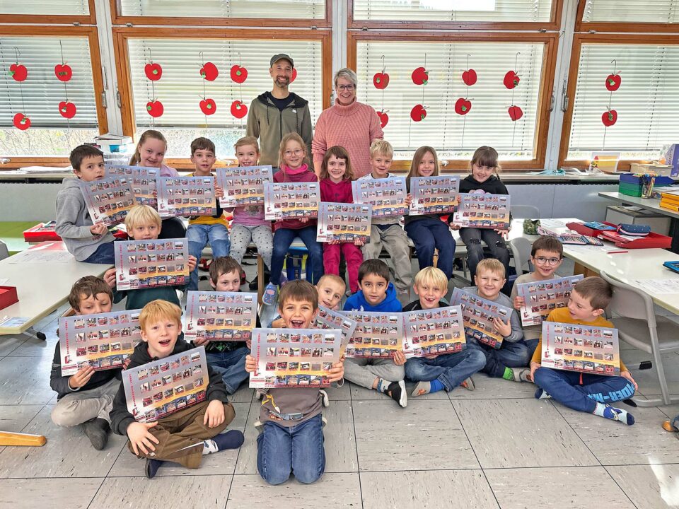Bereits zum dritten Mal hat Thomas Lehmann, Geschäftsführer der Lehmann Bauunternehmen GmbH (hinten links), die Brandenkopfschule in Oberharmersbach besucht, um den Schülerinnen und Schülern der 1. Klasse eine Freude zu bereiten.