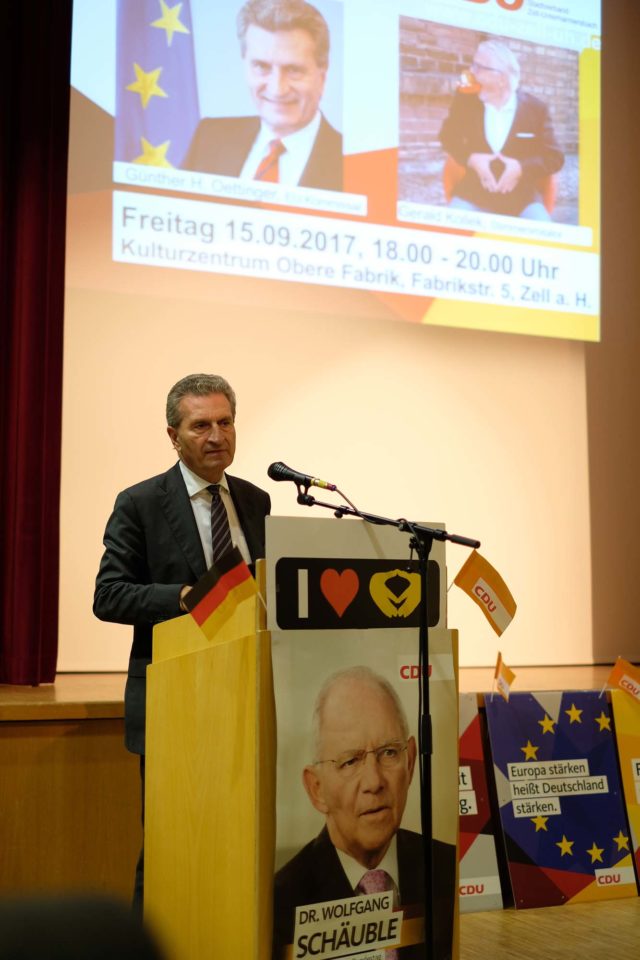 Günther Oettinger (CDU), EU-Kommissar für Haushalt und Personal, sprach am Freitagabend im Kulturzentrum Obere Fabrik über die Wichtigkeit, Europa zu stärken. Ein Europa, das in der Nachkriegsgeschichte viel Gutes gebracht hat, sich zunehmend jedoch einem »Wettbewerb der Werteordnungen« ausgesetzt sehe.