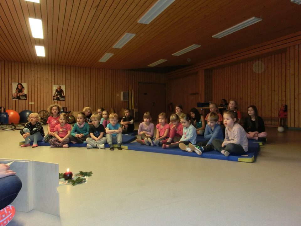 Am letzten Montag vor den Ferien war ein besonderer Turnnachmittag für die Kinder, denn die Übungsleiterinnen Barbara, Mathilde und Kathrin haben weihnachtliche Stunden gestaltet. Nachdem geturnt und getobt wurde, gab es für die Kinder das Märchen »Sterntaler«. Bei Gebäck und Getränken machten es sich alle gemütlich und jedes Kind bekam noch ein Weihnachtsgeschenk.