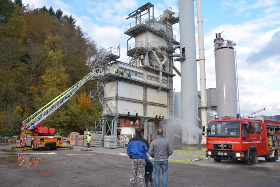 Das Mischwerk der Firma Knäble bildete die Kulisse für die Herbstübung der Biberacher Feuerwehr. Besondere Herausforderungen war die Suche der insgesamt fünf Verletzten auf dem weitläufigen Industrieareal und die Bergung eines Verletzten mit Hilfe der Drehleiter von einer Arbeitsplattform eines der Silos.