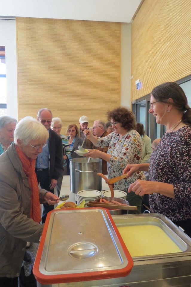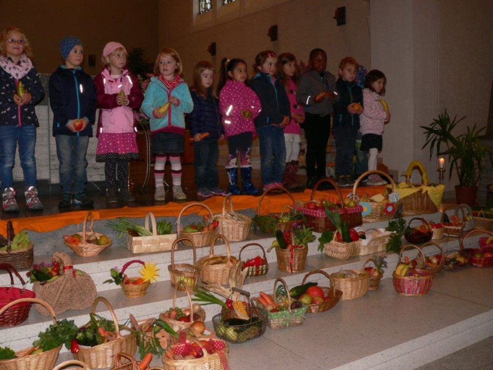 Der Erntedankgottesdienst am Sonntag wurde als Familiengottesdienst gestaltet. Viele Erntegaben schmückten die Altarstufen, zu denen die Kinder ihre Erntekörbchen stellten. Die Musikgruppe »Horizont« sang die kindgerechten Lieder mit. Danach traf sich die Gemeinde beim »Kartoffelsuppe essen« im Pfarrheim.