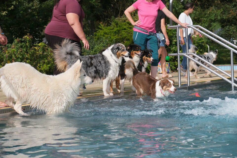 Rund 80 Vierbeiner – vom Schoßhund bis zum Deutschen Schäferhund – stürmten am Samstag das Familienbad und verwandelten es in ein Hundeparadies.