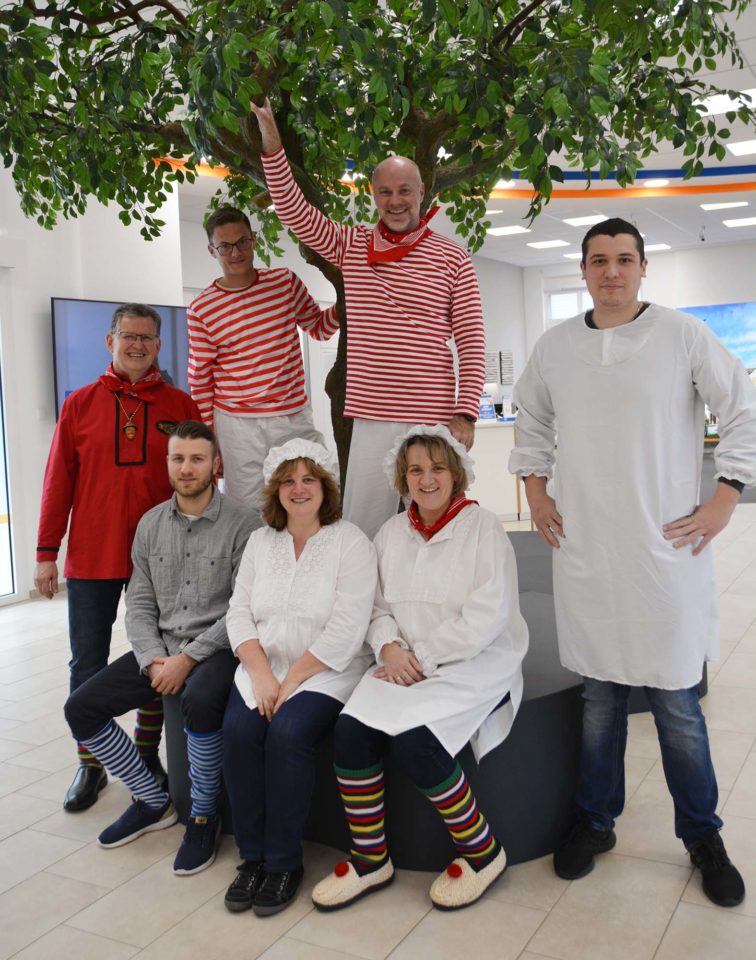 Statt in angemessener Business-Kleidung empfing das Volksbank-Team um ihren Leiter Mathias Hug (Mitte) die Besucher gestern in echten Hemdglunker-Klamotten.