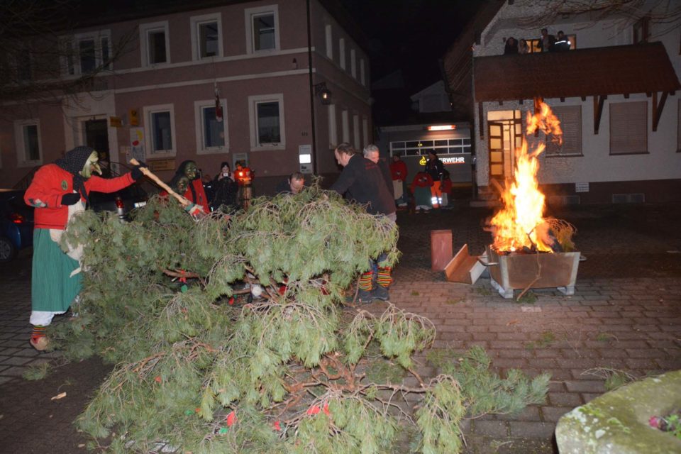Das närrische Leben der Eckwaldhexe und auch der prächtige Narrenbaum nahmen in der Nacht zum Aschermittwoch ein jähes Ende. Selbst der Narrenbrunnen, der seit dem Fasendsamstag den Unterharmersbacher Rathausplatz geziert hat, ging in den Flammen des Fasendfeuers auf.