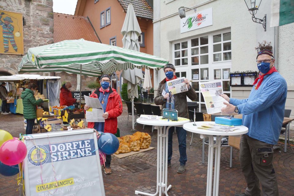 Beim Städtle-Markt am Samstag gab es nicht nur Gemüse, Brot und Wurstwaren, sondern auch närrische Vitamine: Druckfrisch konnte am Sonderstand der Dörfle-Bure die neueste Ausgabe der »Dörfle-Sirene« erworben werden.