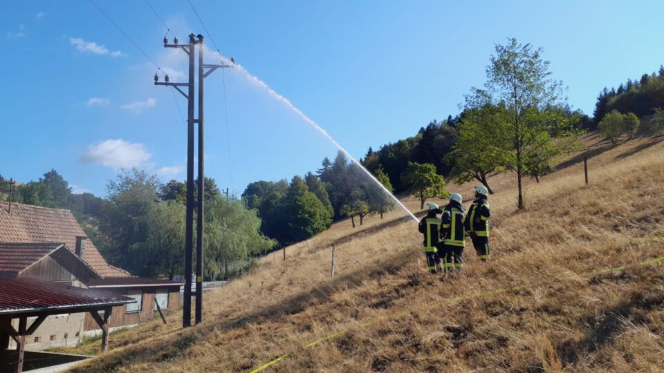 Am Mittwochnachmittag gegen 14 Uhr geriet aus ungeklärter Ursache in Nordrach im Bereich Kohlberg/Merkenbach eine Wiesenfläche auf ca. 250 Quadratmetern an einem Steilhang in Brand.