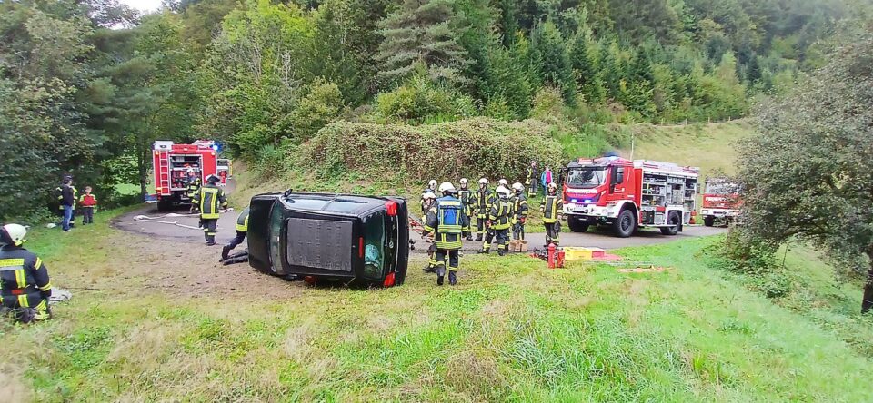 Auf der engen Straße sind ein Pkw und ein Motorrad zusammengestoßen. Realitätsnahe Herbstübung der Feuerwehr Nordrach.