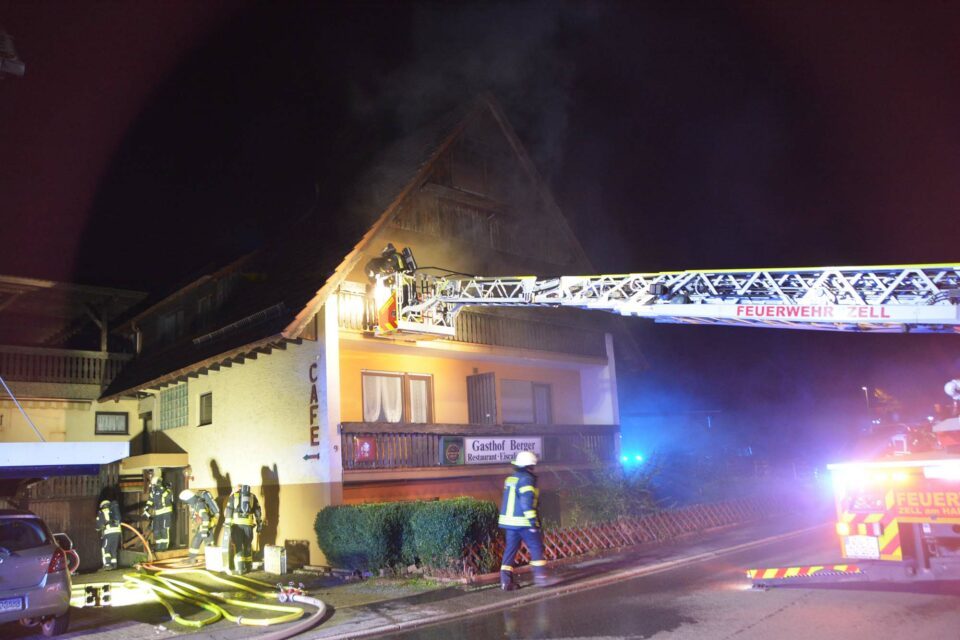 Dichter Rauch drang am Freitagabend aus dem Dachgeschoss des leerstehenden Gasthauses Berger. Im Kellergeschoss war ein offenes Feuer ausgebrochen. Mit einem lauten Knall gibt es eine Durchzündung. Ein Mann stand auf dem Balkon und schrie um Hilfe. Seine Frau befinde sich noch im Inneren des Hauses.