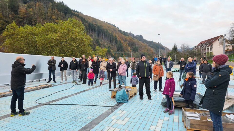 Dank der Millionenspende des im Sommer verstorbenen Ehrenbürgers und Fabrikanten Erwin Junker schreiten die Arbeiten am Nordracher Schwimmbad gut voran: Am Freitag wurde Richtfest gefeiert.