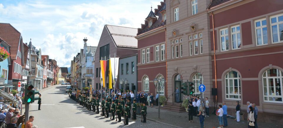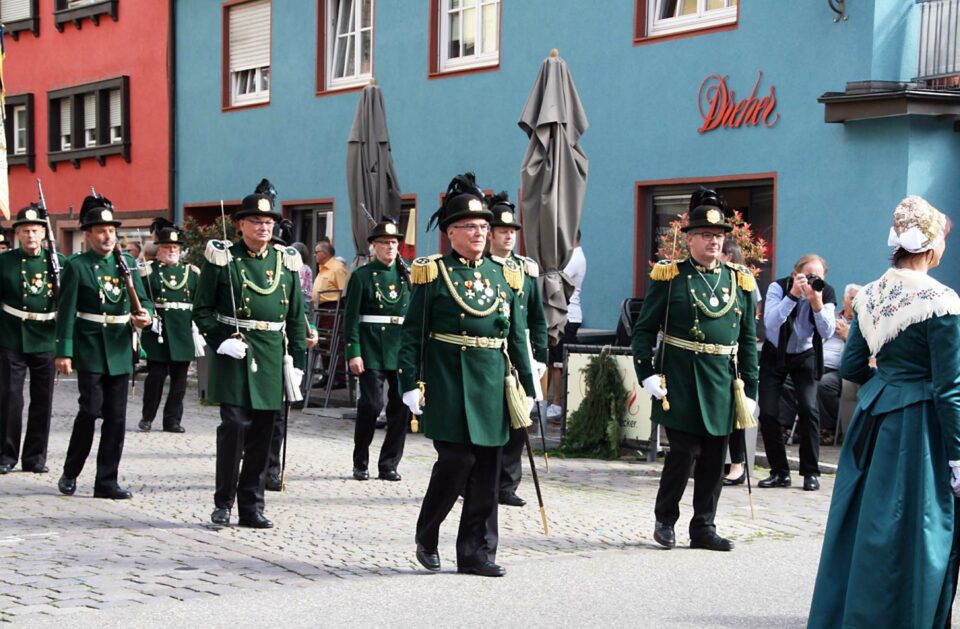Mehr als sechzig Kommandanten und Spielmannszugführer des Landesverbandes Baden-Südhessen haben sich in ihren prächtigen Uniformen in Villingen zu ihrer jährlichen Tagung versammelt. Dem Verband sind 22 historische Bürgerwehren und Garden, vom Bodensee bis zur Bergstraße, mit über 1.200 Mitgliedern angeschlossen.