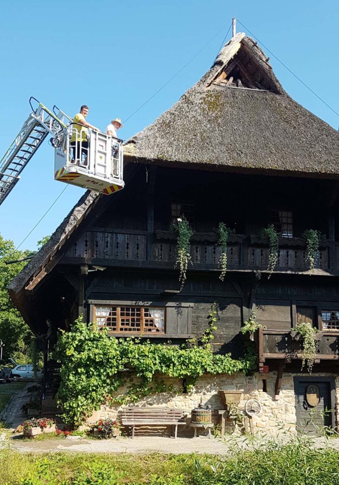 Das durch Wind und Wetter und auch durch Tiere an verschiedenen Stellen verrupfte Walmdach des Fürstenberger Hofs wurde durch den bekannten Fachmann für Schwarzwälder Reetdächer, Walter Epting aus Kirnbach, wieder repariert.