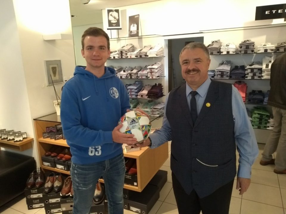 Elfmeterschütze trifft Freistoßspezialist: Die Ballspende für das FVU-Heimspiel am Sonntag, 15 Uhr, stammt von Michael Ruf, Geschäftsführer der Steuerberatungsgesellschaft Ortax in Zell am Harmersbach Er übergab den Spielball an FVU-Kapitän Matthias Lehmann.