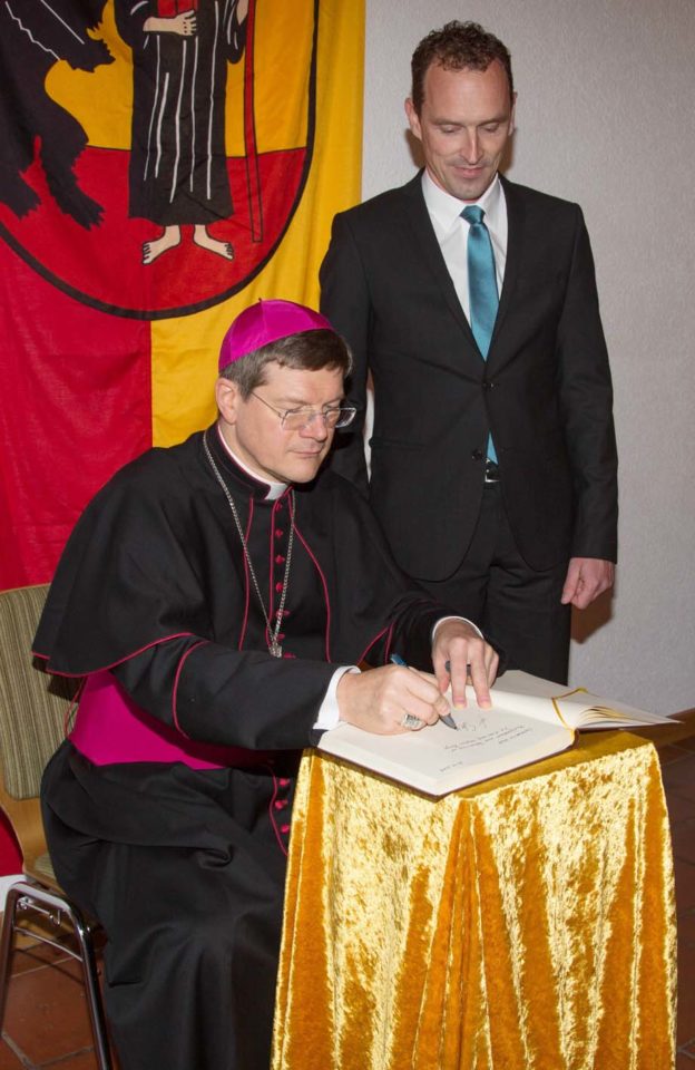 Den Besuch des Freiburger Erzbischofs Stephan Burger nutzt die Gemeinde Oberharmersbach, um ihr Goldenes Buch um einen weiteren Eintrag zu bereichern.