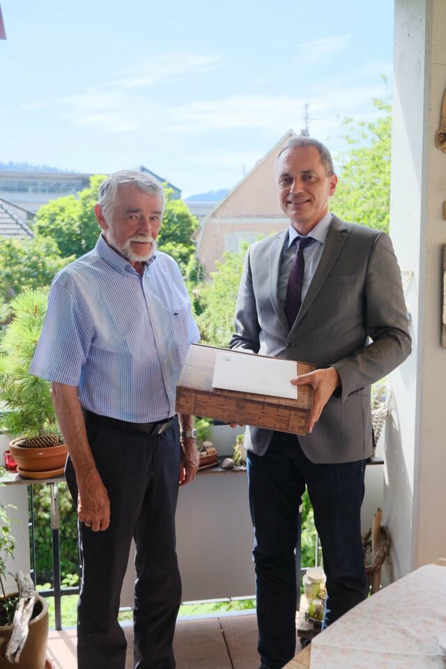 Am Karfreitag, 15. April 2022, konnte der Nordracher Ehrenbürger Erwin Junker seinen 92. Geburtstag feiern. Zu den Gratulanten zählten Bürgermeister Carsten Erhardt und Zells Bürgermeister Günter Pfundstein.