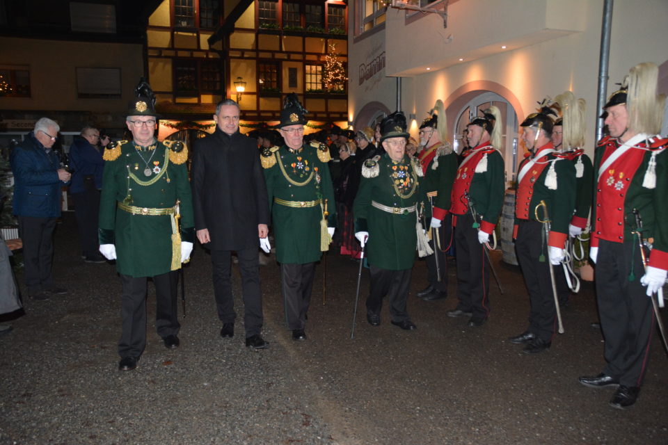 Am Samstagabend war die Zeller Bürgerwehr geschlossen angetreten, um Werner Faißt zum Geburtstag zu gratulieren. Gemeinsam schritten Hauptmann Paul Gutmann, Bürgermeister Günter Pfundstein, Landesehrenkommandant Bernhard Lehmann und Jubilar Werner Faißt die Ehrenformation ab.
