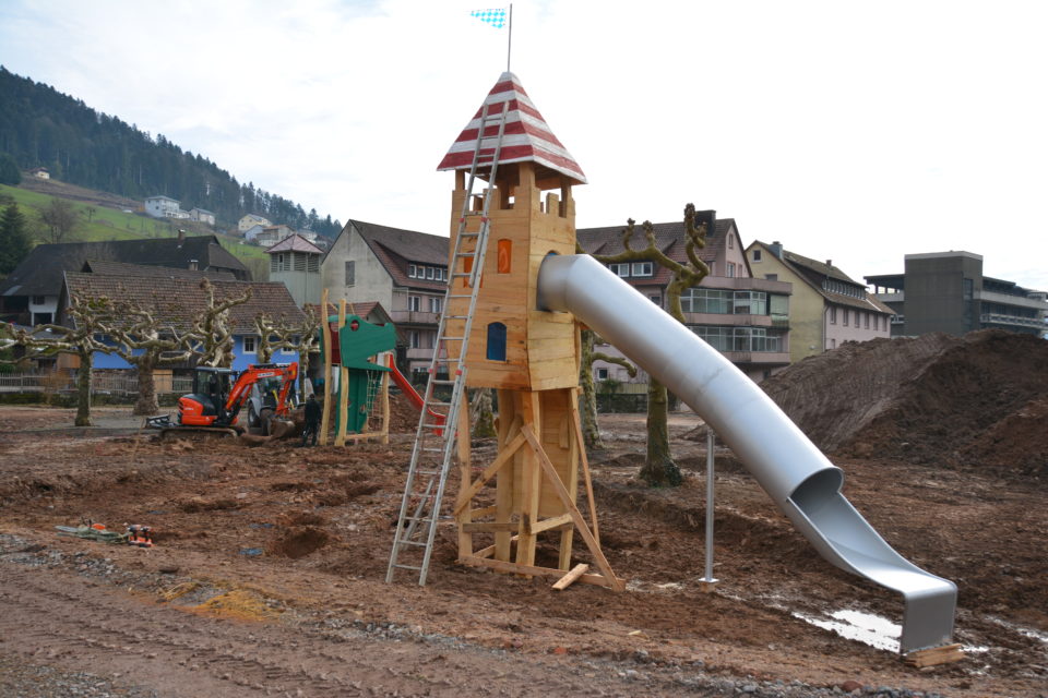 Nach der Winterpause konnten im Nordracher Dorfpark die Bauarbeiten fortgesetzt werden. Neben den umfangreichen Erdarbeiten haben nun auch die ersten Spielgeräte Einzug gehalten. Ein großer Spielturm reckt sich als sichtbares Zeichen des Baufortschritts in die Höhe. Und auch der grüne »Nordrache« fletscht schon seine weißen Zähne.
