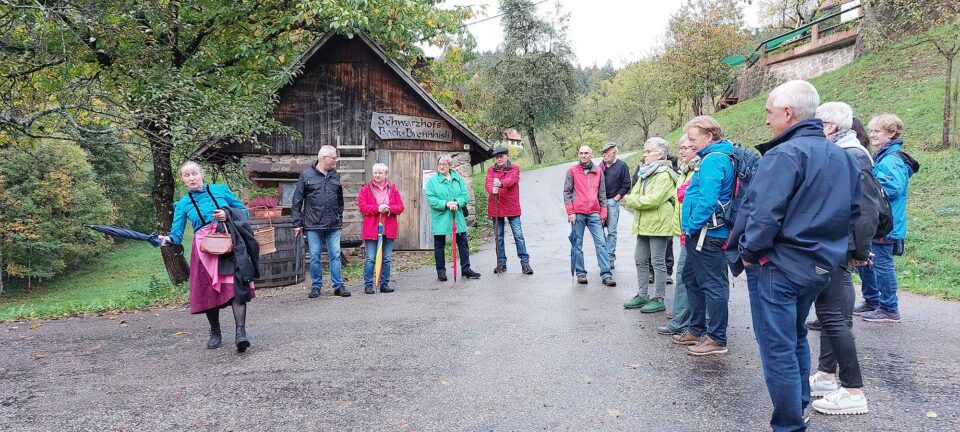 Die »Pfifferle Zäzel« hat einst auf einem armen Einsiedlerhof im Bechtenbach in Nordrach gelebt. Angela Boschert schlüpfte im Rahmen einer sagenhaften Kurzwanderung im Moospfaff-Monat Oktober in diese Rolle und nahm ihre Gäste zunächst auf eine Rundwanderung über den Ernsbach mit.
