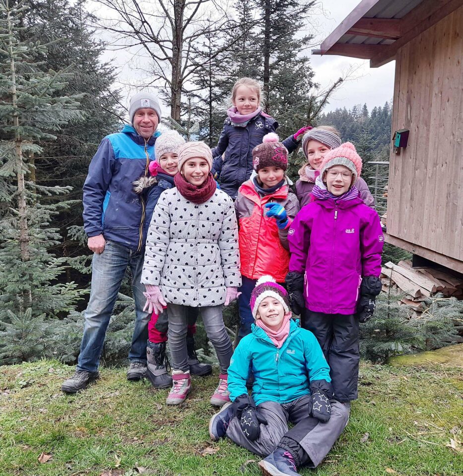 Bei trockenem Winterwetter hatten Reinhard Lehmann (Erlebnis- und Umweltpädagoge) und sieben Mädchen viel Spaß auf dem Bauernhof am Erbsengrund.