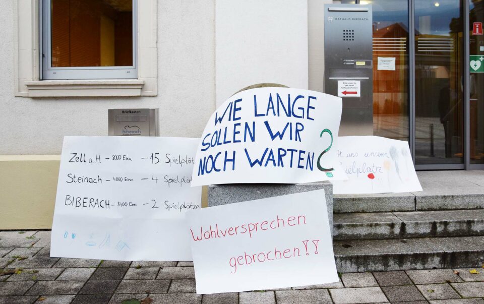 Ein ungewohnter Anblick bot sich Bürgern die am Montag die öffentliche Gemeinderatssitzung besuchen wollten. Vor dem Rathaus-Eingang waren etliche Protestschilder drappiert. Mit Slogans wie »Wahlbetrug« und »Wie lange müssen wir noch warten?«, wurde die Entscheidung des Gemeinderats zum Ausstieg aus dem Spielplatzprojekt »Biber-Aue« kritisiert.
