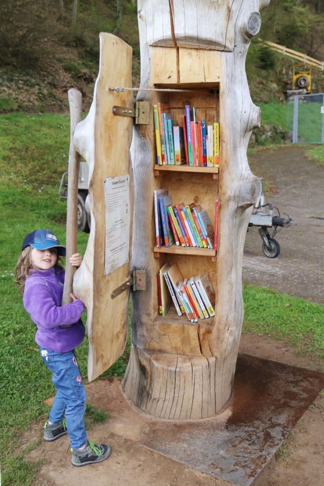 Der Bücherbaum beim Biberbau (Kunstrasen) ist nach der Winterpause nun wieder gefüllt. Es kann wieder munter getauscht werden.