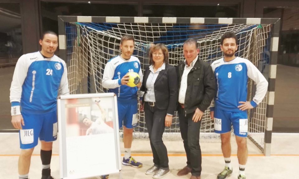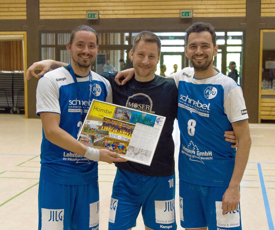 Einen kleinen Anteil am Heimsieg hatte auch der ehemalige Außenspieler Thomas Vollmer (Mitte). Er spendete am Mittwoch den Spielball gegen den HGW Hofweier III.