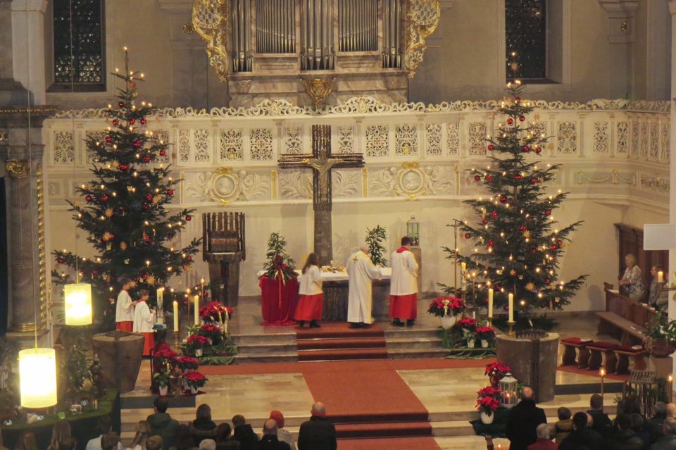 Pater Burkard zog mit vielen Ministranten und den Lektoren in die festliche geschmückte Kirche ein. Beim ersten Teil der Christmette brannten lediglich die Kerzen im Kirchenraum, so dass eine schöne Stimmung entstehen konnte. »Ich freue mich, dass so viele gekommen sind«, begrüßte Pater Burkard die Gemeinde.