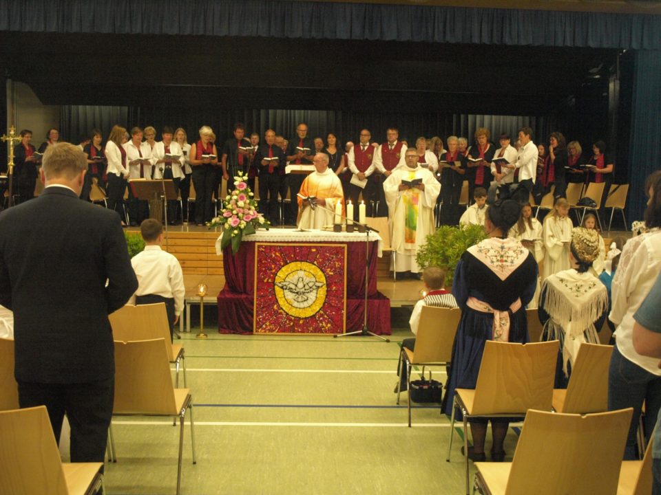 Auch wenn die Türen zur Pfarrkirche wegen der Bauarbeiten verschlossen waren, wurde der Herrgottstag in traditioneller Weise gefeiert. Das Mitwirken der Traditionsvereine von Bürgerwehr, Spielmannszug, Miliz- und Trachtenkapelle sowie der Trachtentanzgruppe prägten wieder in besonderer Weise das kirchliche Hochfest in der Gemeinde.