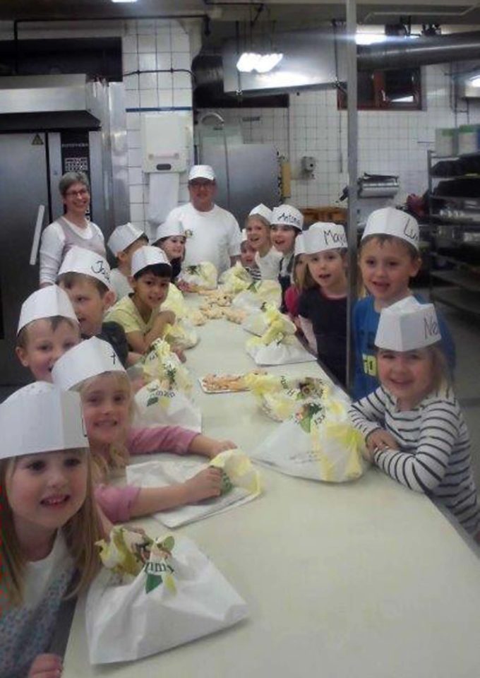 Bäckermeister Franz Lehmann hatte sich Zeit genommen und die 29 Schulfüchse des Kinderhauses Sonnenblume an zwei freien Vormittagen zum Backen und Bestaunen seiner Backstube eingeladen.