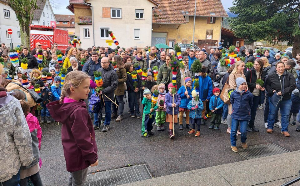 Auf dem Kirchplatz der »St. Blasius«-Kirche versammelte sich am Palmsonntag eine große Schar Kinder mit ihren Eltern, Großeltern und Verwandten. Stolz trugen die Kinder ihre selbstgefertigten Palmstangen in den Händen, die mit der Unterstützung von Erika Rieger, Martina Ringwald und Rita Finkenzeller hergestellt wurden.