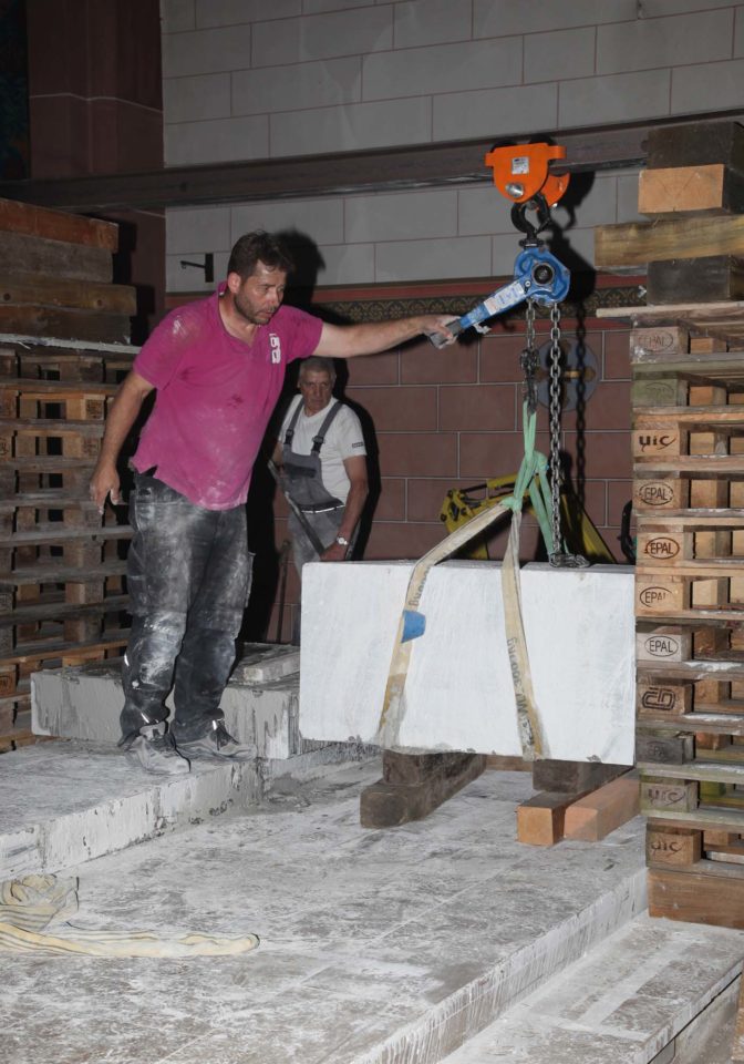 Der über sechs Tonnen schwere Altarstein bestimmte seit der Kirchenrenovation 1968/69 das Bild der Apsis in der Pfarrkirche »St. Gallus«. Jetzt wurde er zerlegt. Aus einem größeren Teilstück modelliert der Merdinger Künstler und Bildhauer Alois Landmann einen Gedenkstein.