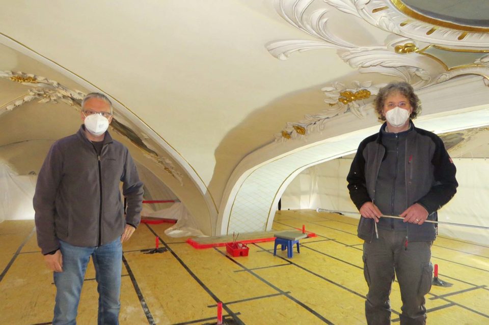 Architekt Michael Wieseler vom erzbischöflichen Bauamt in Freiburg zeigte sich bei einer Baustellenbegehung zufrieden mit dem Stand der Arbeiten. Restaurator Bernhard Wink aus Zell-Weierbach ist zurzeit mit den abschließenden Malerarbeiten beschäftigt.