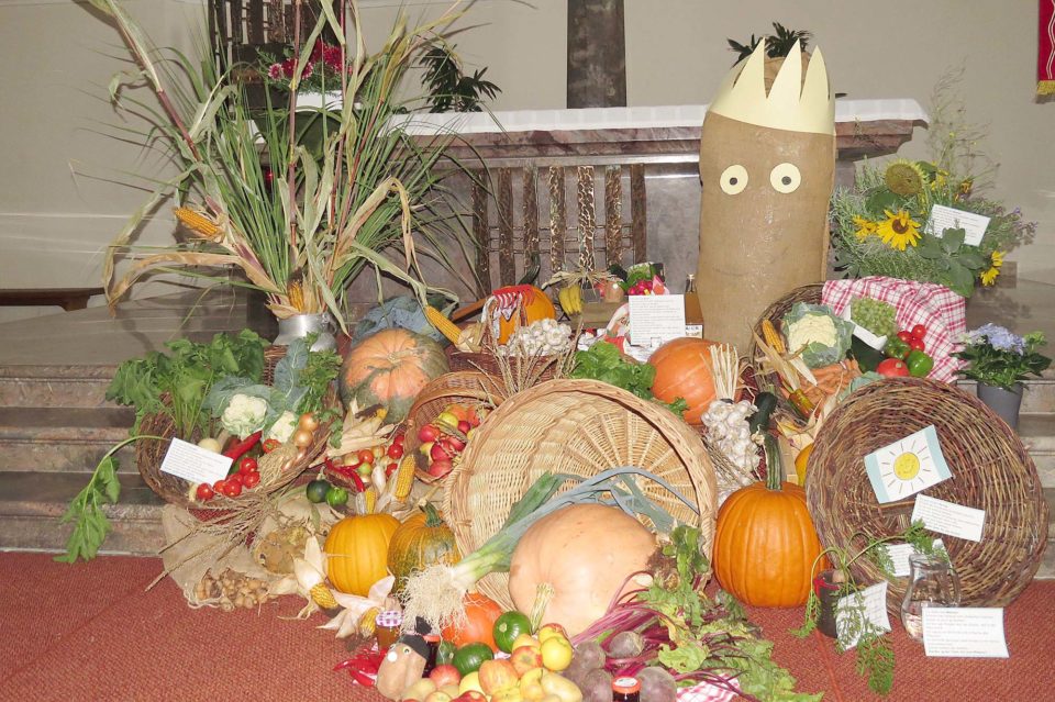 Am Sonntag feierte die katholische Kirchengemeinde Erntedank. Das Familiengottesdienstteam hat mit vielen Erntegaben den schönen Erntedank altar dekorativ aufgebaut.