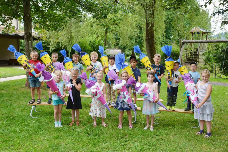 Für zwölf Mädchen und zwölf Buben beginnt im September ein neuer Lebensabschnitt: Sie kommen in die Schule. Mit einem schönen Gartenfest sagten die Schulanfänger »Tschüss, Goodbye…« zu ihrem Kindergarten »Kleine Wolke« und »am Schluss gab’s einen dicken Kuss« für alle Erzieherinnen und ein großes Dankeschön für eine unvergess liche Zeit.