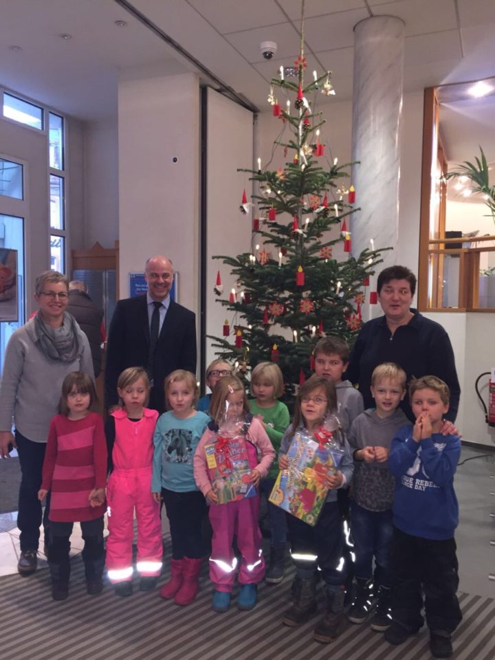 Kindergartenkinder schmücken den Christbaum in der Volksbank Zell