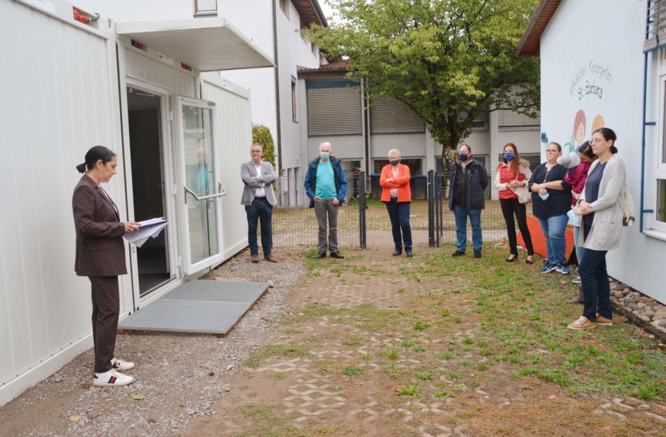Der Kindergarten St. Barbara hat nun eine dritte Gruppe mit 25 neuen Plätzen für Ü3-Kinder. Ende August und Anfang September wurden die Container aufgestellt, die inzwischen wohnlich ausgestattet sind und von den Kindern schon in Beschlag genommen wurden. Am heutigen Freitagvormittag konnte die Containerlösung offiziell ihrer Bestimmung übergeben werden.