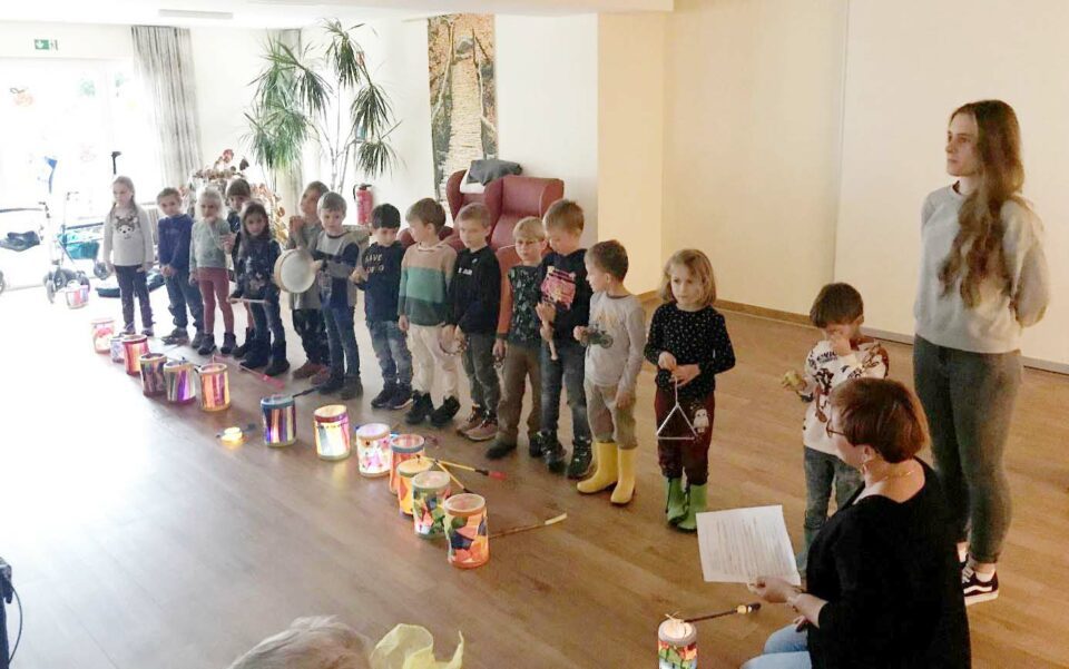 Kindergartenkinder tragen Licht in das Nachbarschaftshaus
