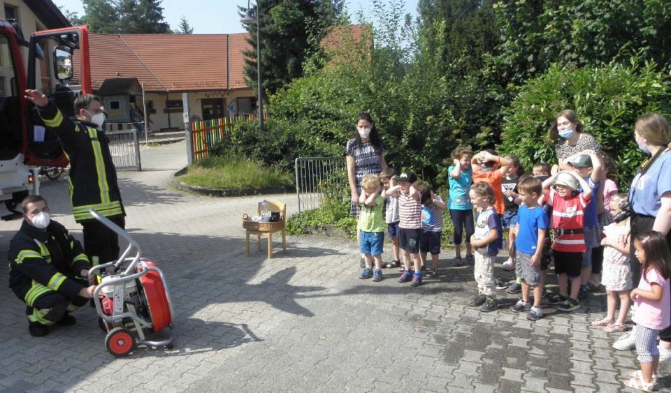 Voller Spannung und mit großem Hallo begrüßten die Kinder des Kath. Kindergartens St. Ulrich die Feuerwehr mit dem Löschfahrzeug im Kindergarten.