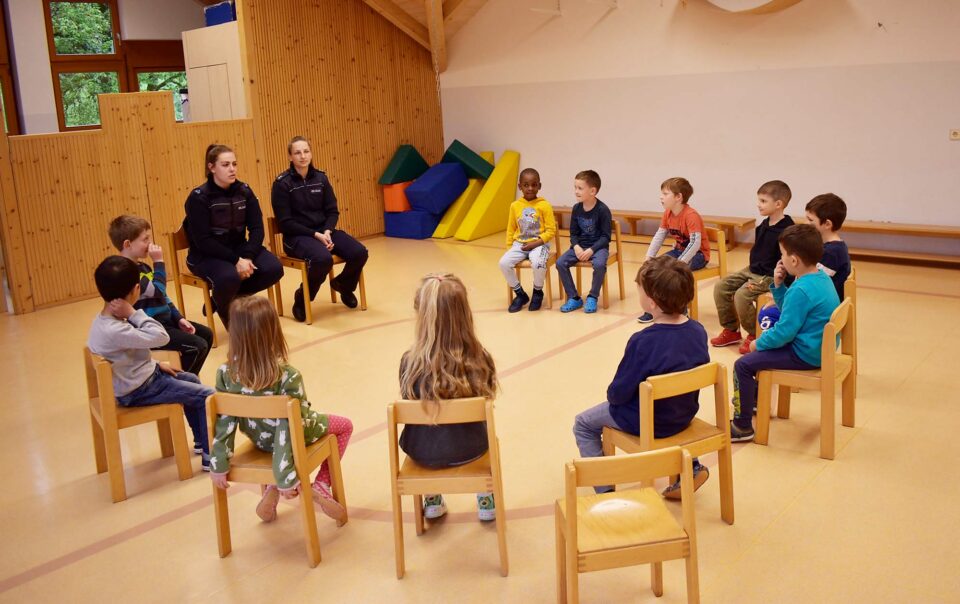 Die Schulanfänger haben dank zweier Polizistinnen vom Polizeirevier Haslach spannende Einblicke in die Arbeit der Polizei erhalten. Gleichzeitig übten sie Verkehrsregeln ein.