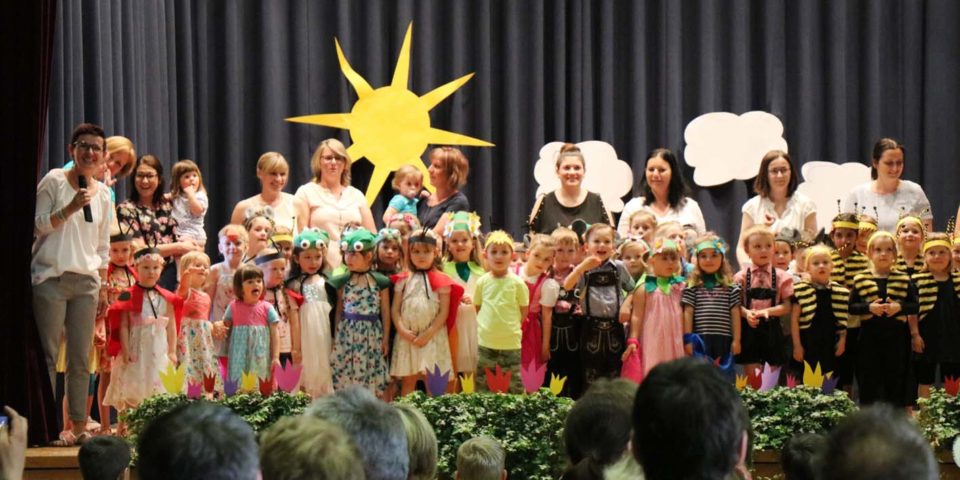 70 Kinder des Kindergartens Villa Regenbogen verzauberten ihre Familien im Kultur- und Vereinszentrum. Viele Eltern, Geschwister und Großeltern waren zur Aufführung »Beim Frühlingsfest auf der Wiese…« gekommen.
